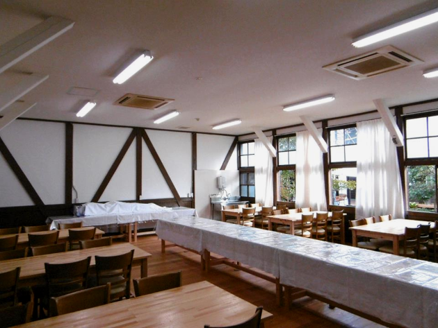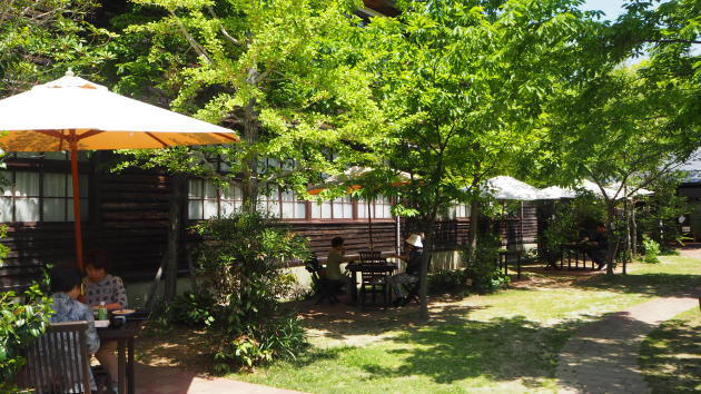 食事を味わう前に旧校舎ときれいに整備された庭が目の前に!まさに異空間である。