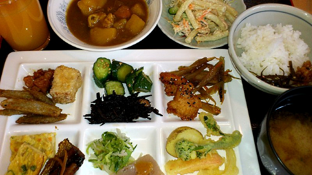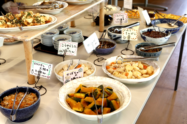 ビュッフェ形式のスローフードランチバイキングです。食材は地元のお父さんたちが使われなくなった放任園を復活させて栽培する野菜や地元の直売所に、毎朝、出荷される野菜を使うなど地元にこだわった食材でお母さんたちが心を込めつくったお料理を提供しています。